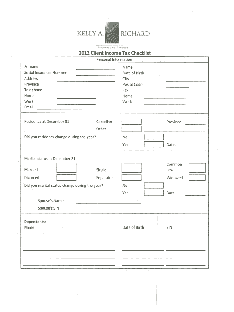 KELLY A. RICHARD. Bookkeeping Services. 2012 Client Income Tax Checklist. Personal Information. Surname. Name. Social Insurance Number. Date of Birth.
