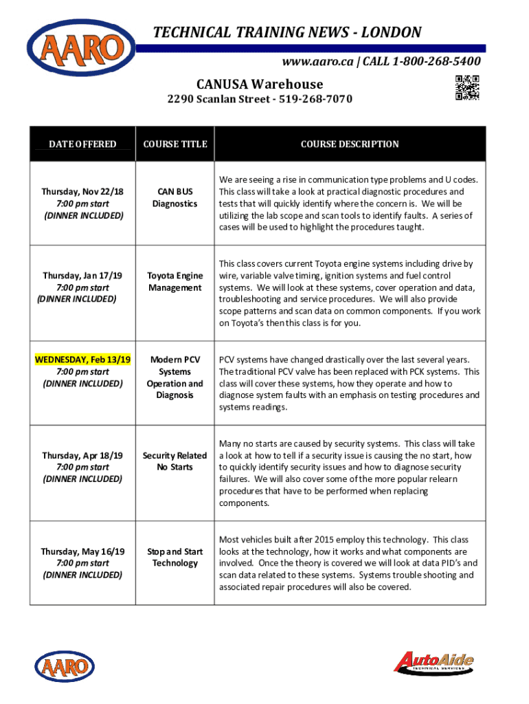 TECHNICAL TRAINING NEWS LONDON www.aaro.ca CALL 18002685400CANUSA Warehouse 2290 Scandal Street 5192687070DATE OFFEREDCOURSE TITLE Thursday, Nov 22/18 7:00 pm start (DINNER INCLUDED)CAN BUS Diagnostics