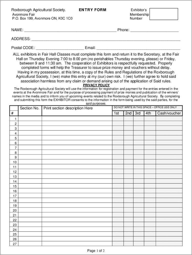 Foxborough Agricultural Society. ENTRY FORMExhibitors Membership NumberAvonmore Fair P.O. Box 199, Avon more ON, K0C 1C0NAME: Phone: ADDRESS: Postal CODE: Email: ALL exhibitors in Fair Hall Classes