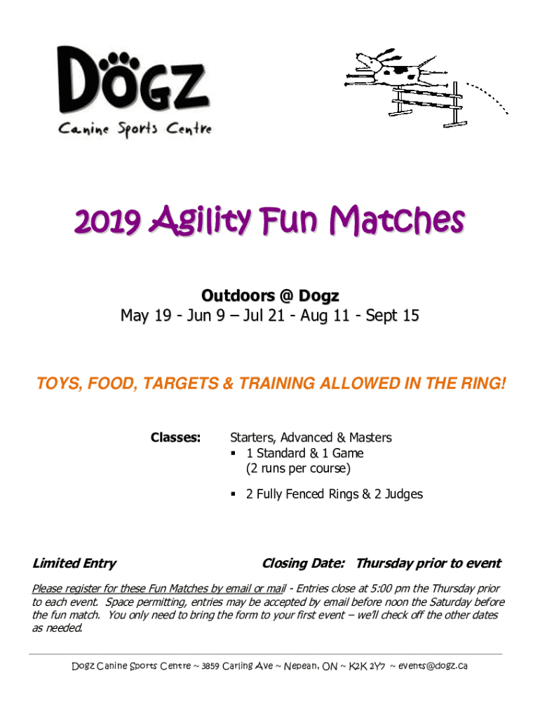 2019 Agility Fun Matches Outdoors Dog May 19 Jun 9 Jul 21 Aug 11 Sept 15TOYS, FOOD, TARGETS & TRAINING ALLOWED IN THE RING! Classes:Starters, Advanced & Masters 1 Standard & 1 Game (2 runs per course)