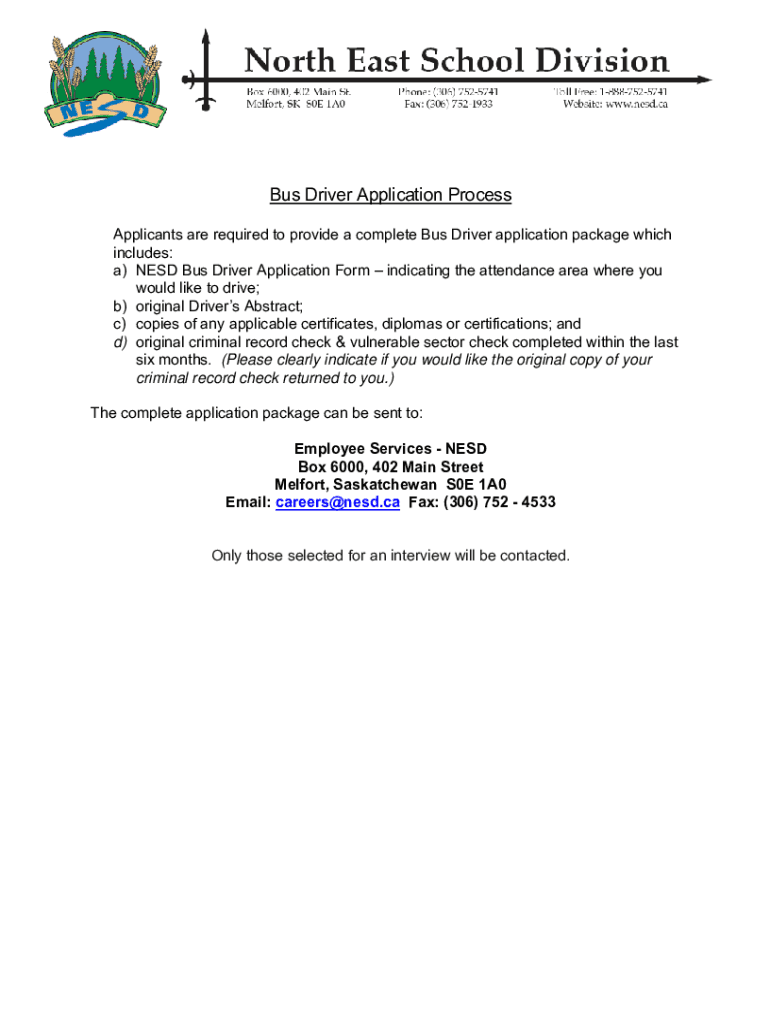 Bus Driver Application Process Applicants are required to provide a complete Bus Driver application package which includes: a) NEED Bus Driver Application Form indicating the attendance area where