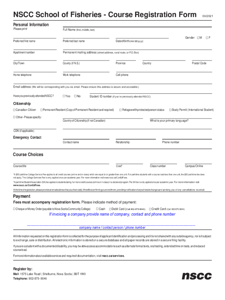 SCC School of Fisheries Course Registration Form03/2021Personal Information Please painful Name (first, middle, last)Preferred first namePreferred last nameApartment numberPermanent mailing address