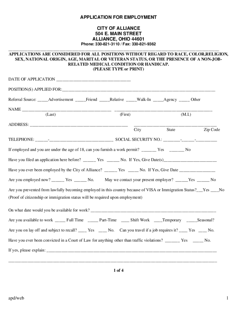 APPLICATION FOR EMPLOYMENT CITY OF ALLIANCE 504 E. MAIN STREET ALLIANCE, OHIO 44601 Phone: 3308213110 / Fax: 3308219362 APPLICATIONS ARE CONSIDERED FOR ALL POSITIONS WITHOUT REGARD TO RACE, COLOR,