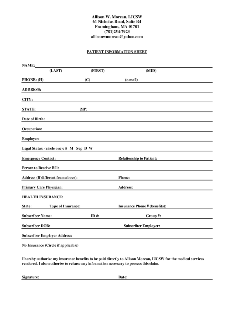 Get the free Allison W. Moreau, LICSW, 61 Nicholas Rd Suite B4 ...