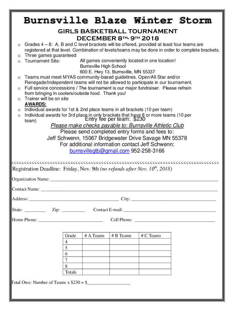 Barnesville Blaze Winter Storm GIRLS BASKETBALL TOURNAMENT DECEMBER 8th 9th 2018 o Grades 4 8: A, B and C level brackets will be offered, provided at least four teams are registered at that level.