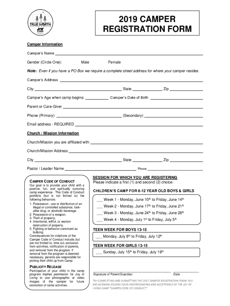 2019 CAMPER REGISTRATION FORM Camper Information Campers Name Gender (Circle One):MaleFemaleNote: Even if you have a PO Box we require a complete street address for where your camper resides. Campers