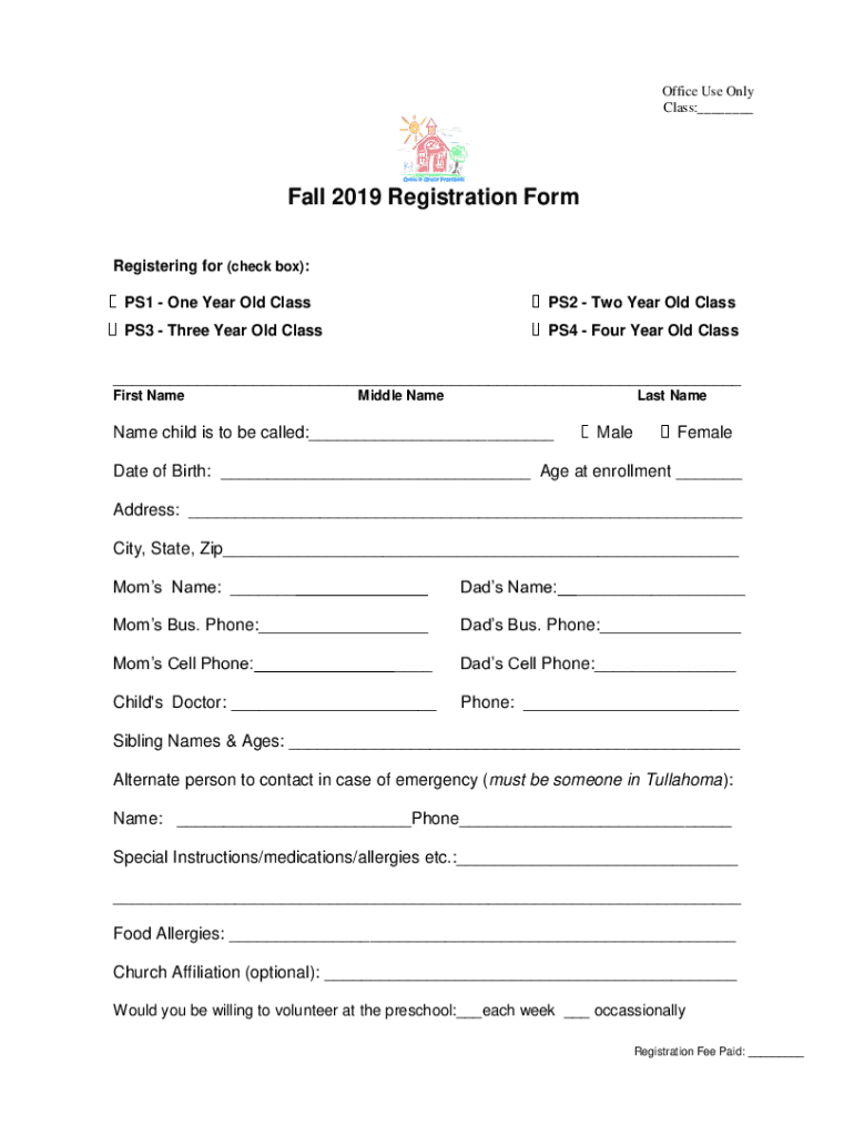 Office Use Only Class: Grow in Grace PreschoolFall 2019 Registration Form Registering for (check box): PS1 One-Year-Old ClassPS2 Two-Year-Old ClassPS3 Three Year Old ClassPS4 Four Year Old Class First