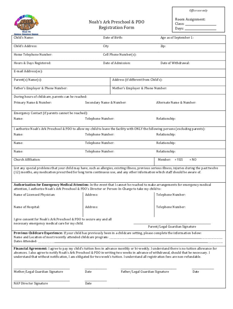 Office use ballroom Assignment: Class: Days:Noah's Ark Preschool & PDO Registration Form Child's Name:Date of Birth:Age as of September 1:Child's Address:City:Home Telephone Number:Cell Phone Number(s):Hours