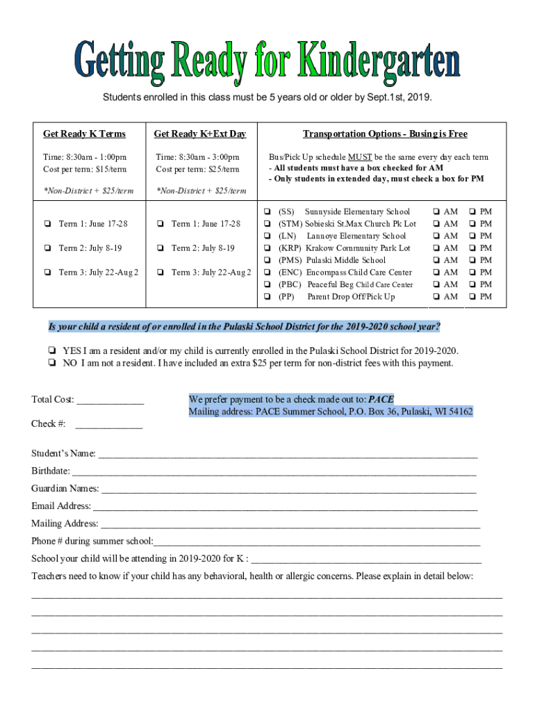 Students enrolled in this class must be 5 years old or older by Sept.1st, 2019. Get Ready K Terms Ready K+Ext Daytime: 8:30am 1:00pm Cost per term: $15/termite: 8:30am 3:00pm Cost per term: $25/term×District