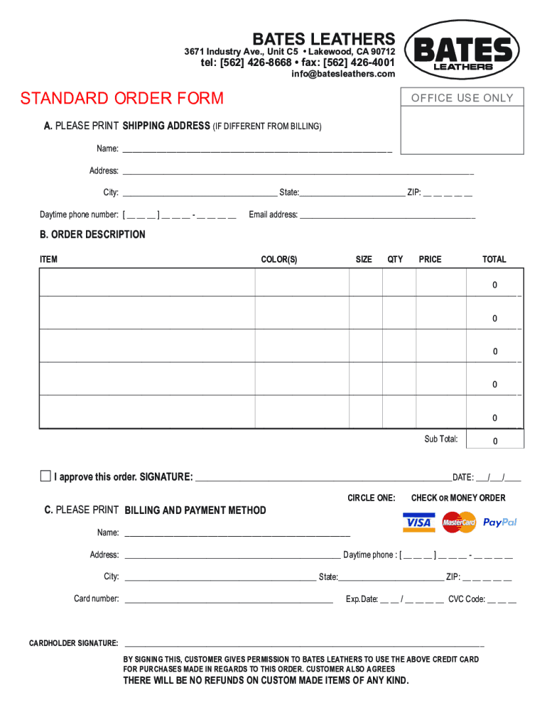 BATES LEATHERS3671 Industry Ave., Unit C5 Lakewood, CA 90712tel: 562 4268668 faxes: 562 4264001 info bates leathers. Nonstandard ORDER FORMOFFICE USE ONLY. PLEASE PRINT SHIPPING ADDRESS (IF DIFFERENT