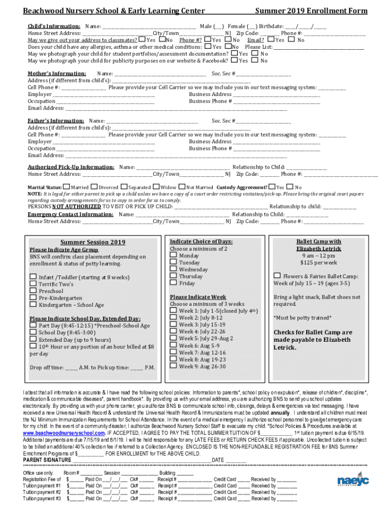 Beachwood Nursery School & Early Learning Center Summer 2019 Enrollment Orchids Information: Name: Male () Female () Birthdate: / / Home Street Address: City/Town NJ Zip Code: Phone #: May we give