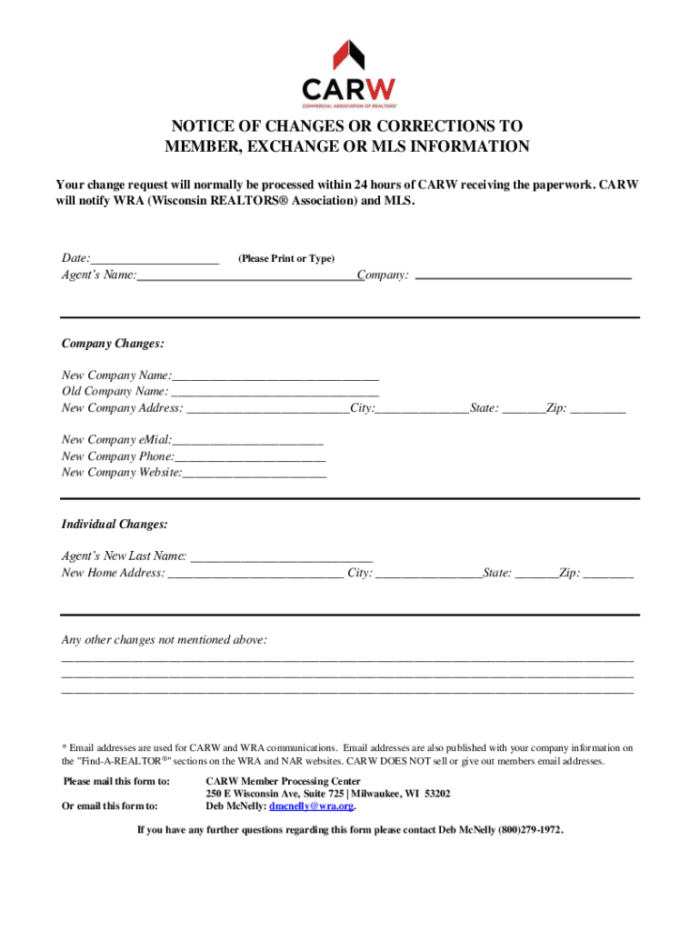 NOTICE OF CHANGES OR CORRECTIONS TO MEMBER, EXCHANGE OR MLS INFORMATION Your change request will normally be processed within 24 hours of CAR receiving the paperwork. CAR will notify ERA (Wisconsin