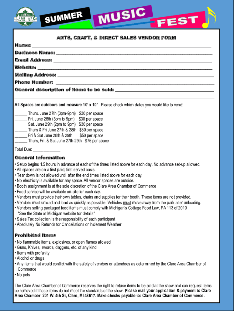 ARTS, CRAFT, & DIRECT SALES VENDOR FORM Name: Business Name: Email Address: Website: Mailing Address: Phone Number: General description of items to be sold: All Spaces are outdoors and measure 10