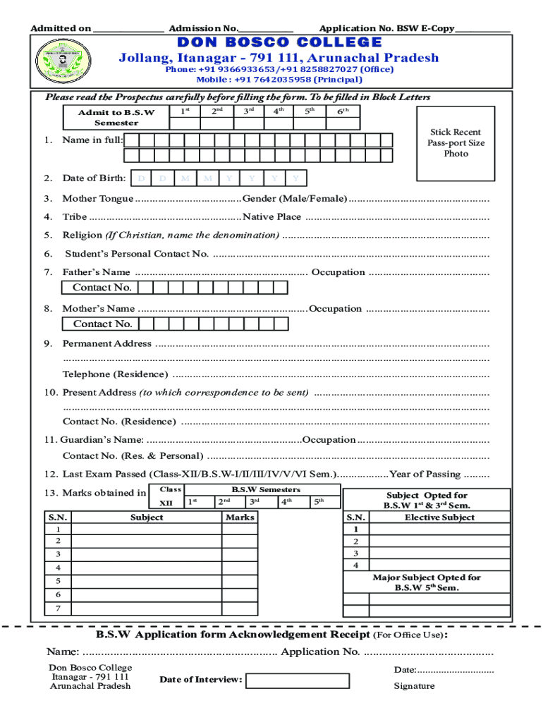 Admitted on Admission No. Application No. BSW Copy DON BOSCO COLLEGEJollang, Tanager 791 111, Arunachal Pradesh Phone: +91 9366933653/+91 8258827027 (Office) Mobile : +91 7642035958 (Principal)Please