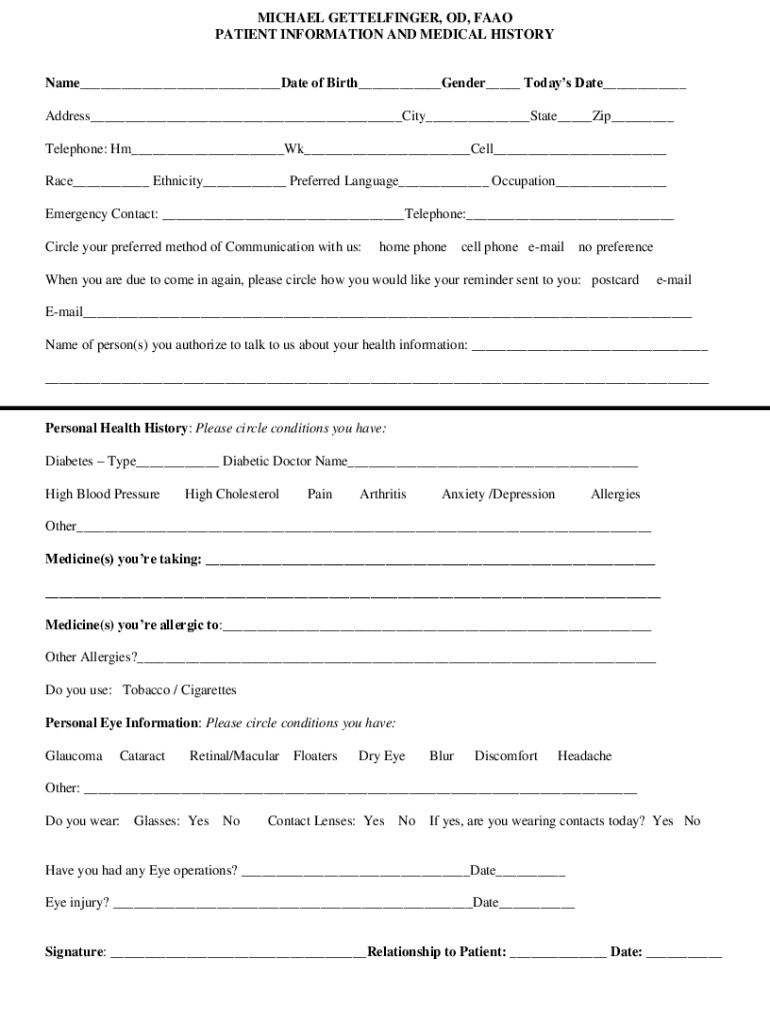 MICHAEL GETTELFINGER, OD, FAO PATIENT INFORMATION AND MEDICAL HISTORY Name Date of Birth Gender Today's Date Address City State Zip Telephone: Hm Wk Cell Race Ethnicity Preferred Language Occupation