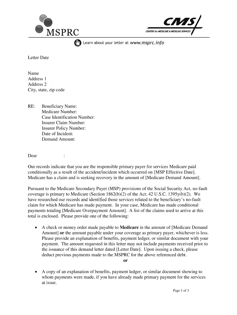 Letter Date Name Address 1 Address 2 City, state, zip code RE: Dear Beneficiary Name: Medicare Number: Case Identification Number: Insurer Claim Number: Insurer Policy Number: Date of Incident: Demand