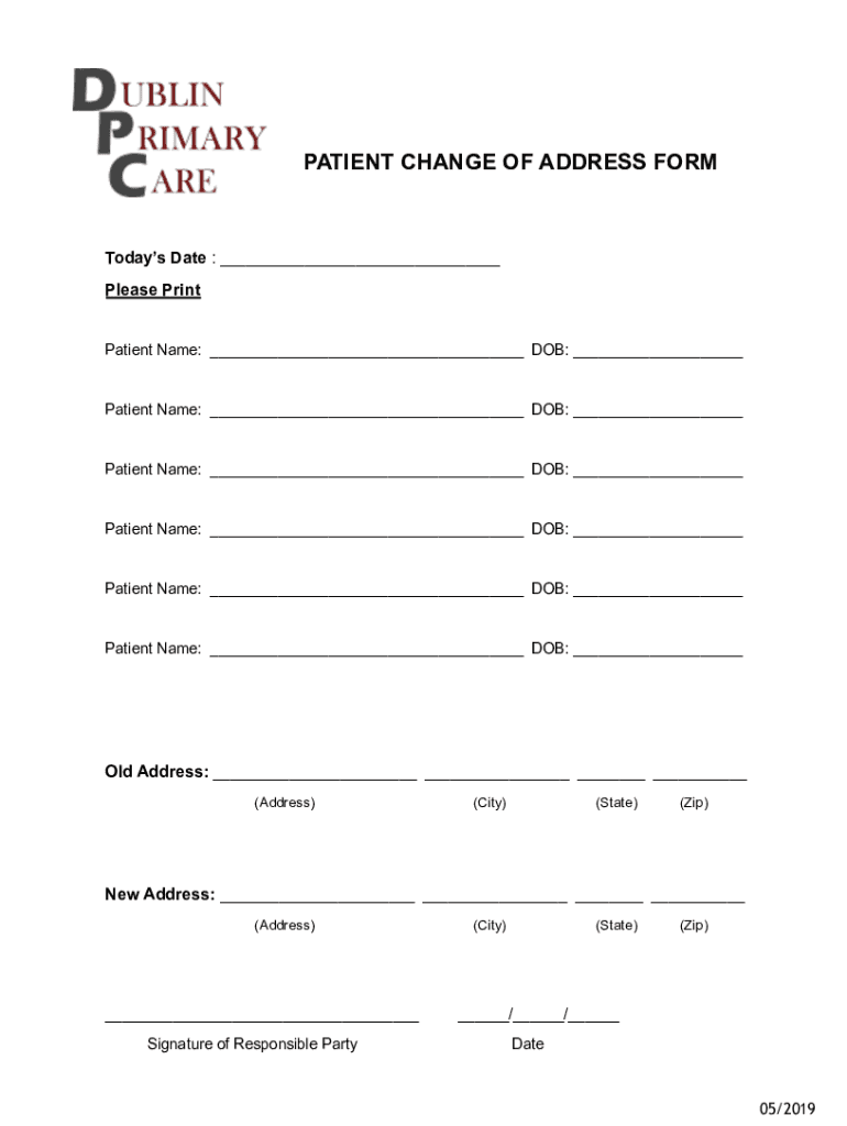 PATIENT CHANGE OF ADDRESS FORMTodays Date : Please Print Patient Name: DOB: Patient Name: DOB: Patient Name: DOB: Patient Name: DOB: Patient Name: DOB: Patient Name: DOB: Old Address: (Address)(City)(State)(Zip)New
