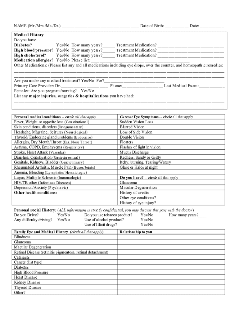 NAME (Mr./Mrs./Ms./Dr.) Date of Birth: Date: Medical History Do you have Diabetes? Yes/No How many years? Treatment Medication? High blood pressure? Yes/No How many years? Treatment Medication? High
