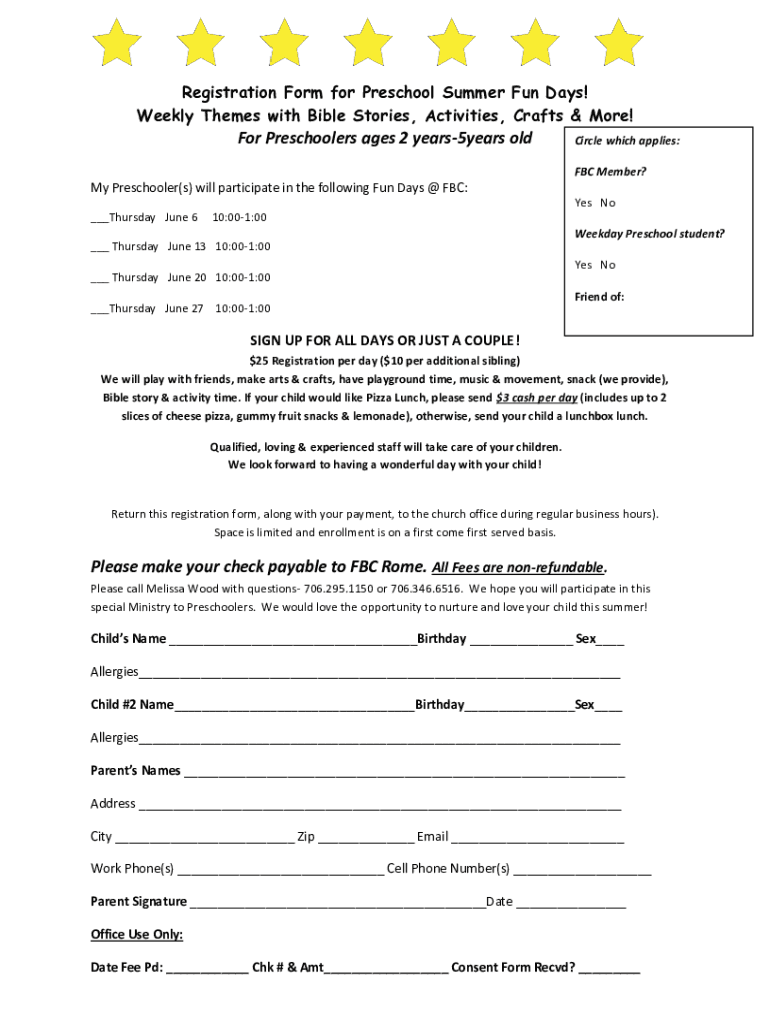 Registration Form for Preschool Summer Fun Days! Weekly Themes with Bible Stories, Activities, Crafts & More! For Preschoolers ages 2 years5years circle which applies: BBC Member? My Preschooler(s)