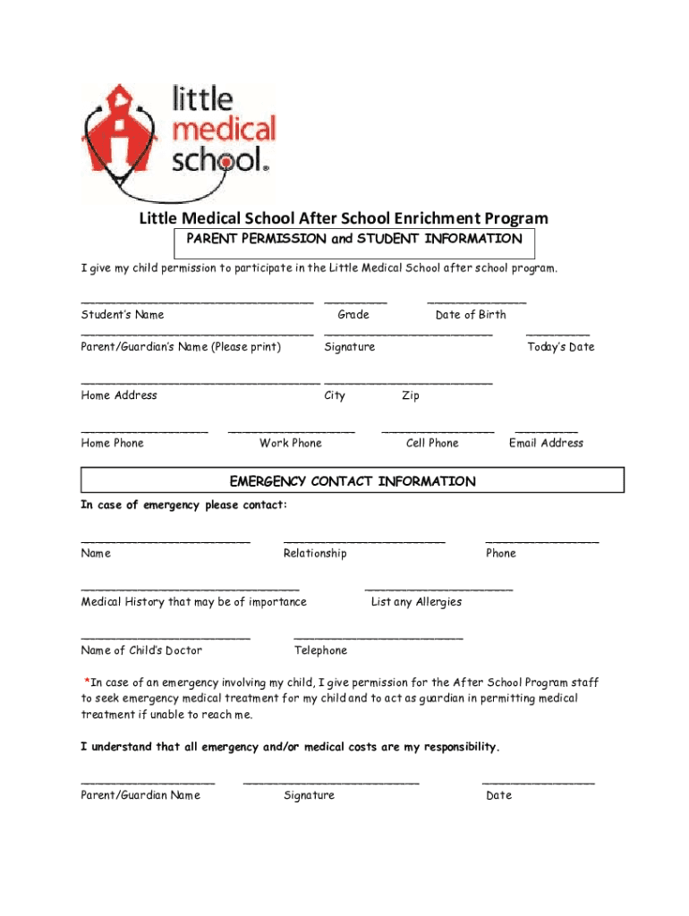 Little Medical School After School Enrichment Program PARENT PERMISSION and STUDENT INFORMATION I give my child permission to participate in the Little Medical School after school program. Students