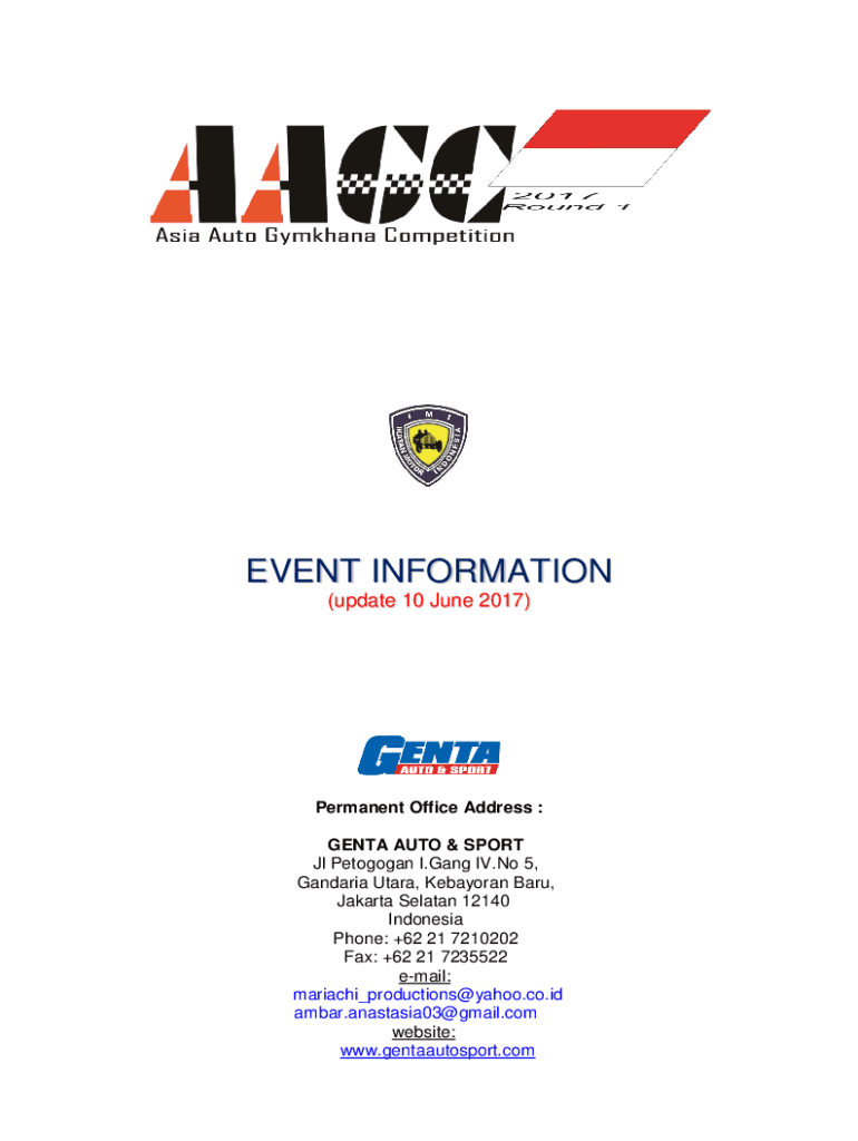 EVENT INFORMATION2017 AGC of INDONESIA Semarang, Central Java, Indonesia 2122,July, 2017EVENT INFORMATION (update 10 June 2017)Permanent Office Address : GENOA AUTO & SPORT Jr Petogogan I. Gang IV.