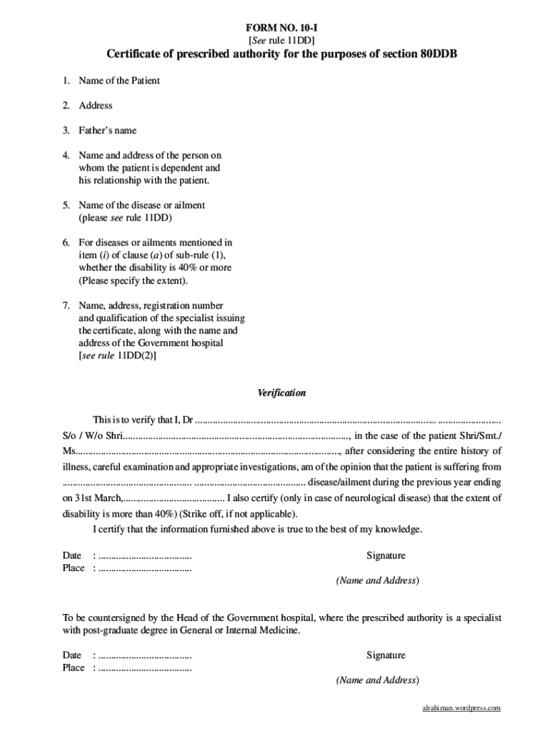 FORM NO. 10I See rule 11DD Certificate of prescribed authority for the purposes of section 80DDB 1. Name of the Patient 2. Address 3. Fathers name 4. Name and address of the person on whom the patient