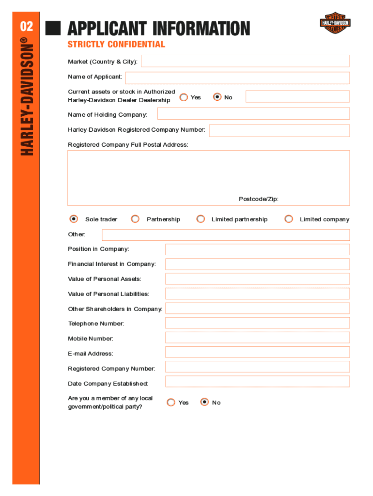 Harley-Davidson DEALER APPLICATION FORMDISCLAIMER & PRIVACY NOTICE This document is an application form. Its purpose is to ensure that the Harley-Davidson brand is represented by suitable businesses