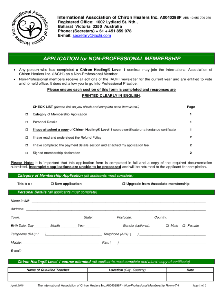 International Association of Chiron Healers Inc. A0040298FABN 12 650 790 270Registered Office: 1002 Lydia rd St. Nth., Ballarat Victoria 3350 Australia Phone: (Secretary) + 61 + 451 859 978 Email: