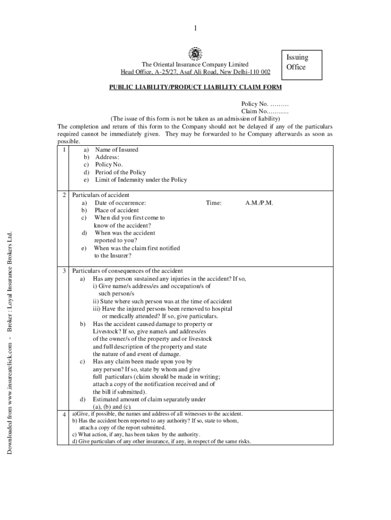 1The Oriental Insurance Company Limited Head Office, A25/27, USAF Ali Road, New Delhi110 002Issuing OfficePUBLIC LIABILITY/PRODUCT LIABILITY CLAIM FORM Policy No. Claim No. (The issue of this form