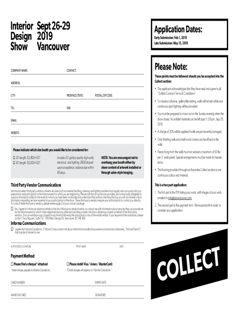Application Dates: Early Submission: Feb 1, 2019 Late Submission: May 15, 2019COMPANY NAME:Please Note:CONTACT:These points must be followed should you be accepted into the Collect section:ADDRESS: