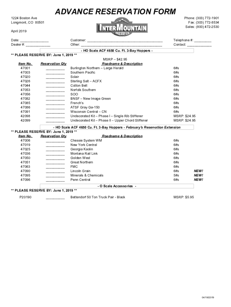 ADVANCE RESERVATION FORM 1224 Boston Ave Longmont, CO 80501Phone: (303) 7721901 Fax: (303) 7728534 Sales: (800) 4722530April 2019 Date: Dealer #: Customer: Other: Telephone #: Contact: HO Scale ACF