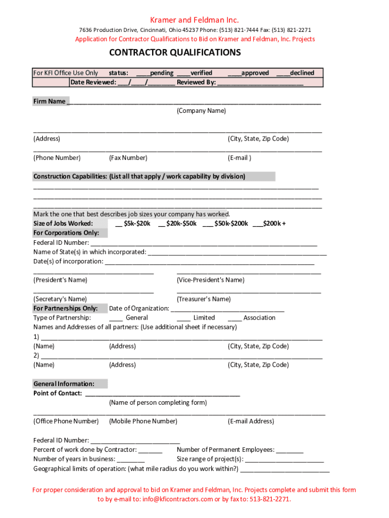 Kramer and Feldman Inc. 7636 Production Drive, Cincinnati, Ohio 45237 Phone: (513) 8217444 Fax: (513) 8212271Application for Contractor Qualifications to Bid on Kramer and Feldman, Inc. ProjectsCONTRACTOR