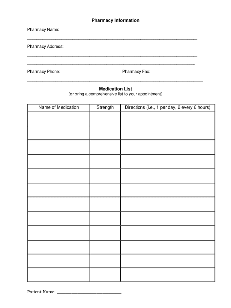 Pharmacy Information Pharmacy Name: Pharmacy Address: Pharmacy Phone:Pharmacy Fax: Medication List (or bring a comprehensive list to your appointment)Name of MedicationStrengthPatient Name: Directions
