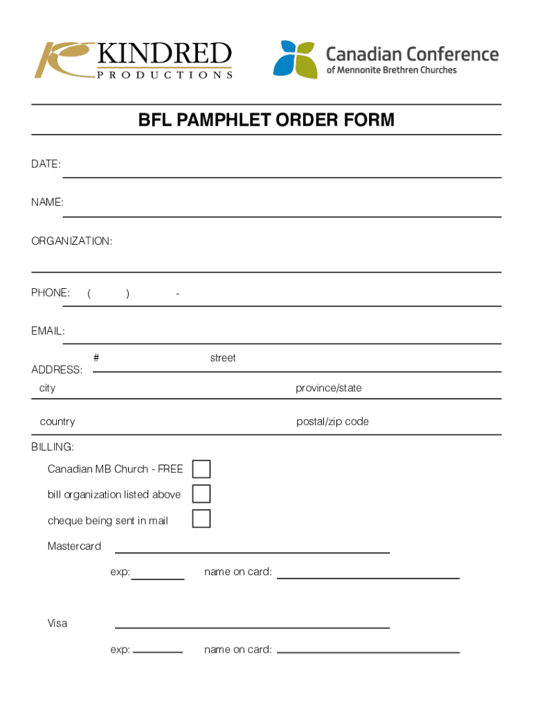 BFL PAMPHLET ORDER FORM DATE: NAME: ORGANIZATION:PHONE:()EMAIL: ADDRESS:#city countrystreetBILLING: Canadian MB Church FREE bill organization listed above check being sent in mail MasterCard:name
