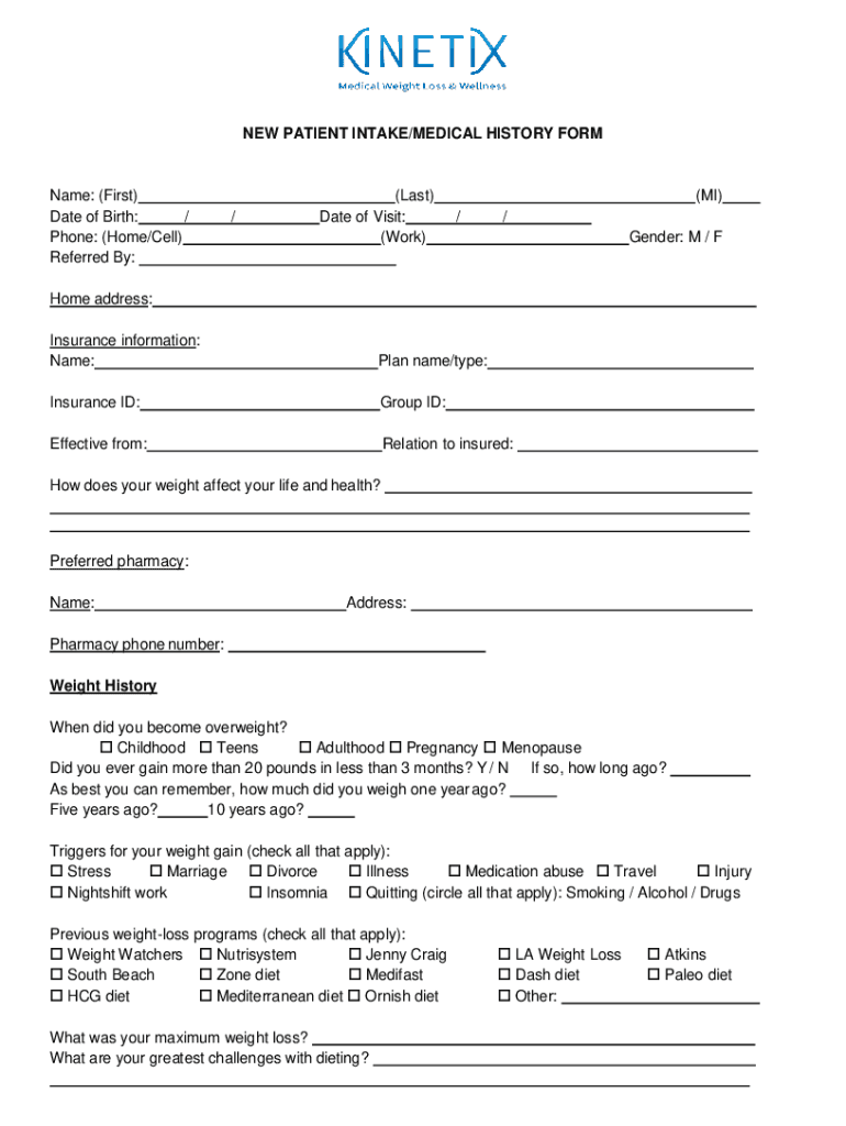 NEW PATIENT INTAKE/MEDICAL HISTORY Forename: (First) Date of Birth: / Phone: (Home/Cell) Referred By:/(Last) Date of Visit: (Work)(MI) // Gender: M / Home address: Insurance information: Name:Plan