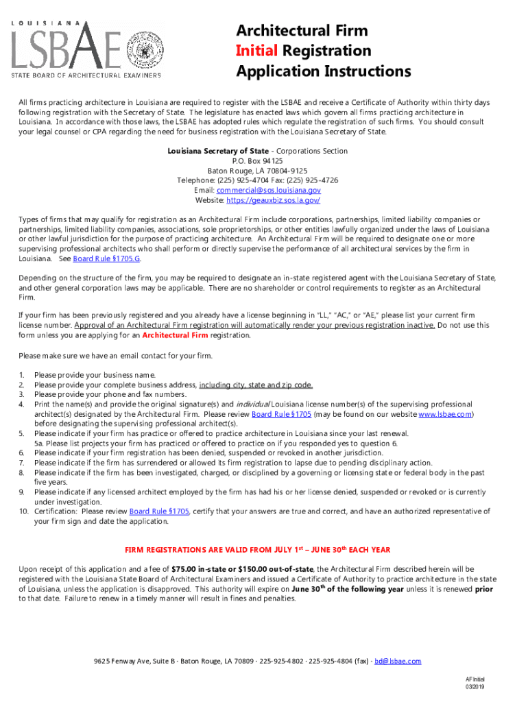 All firms practicing architecture in Louisiana are required to register with the LS BAE and receive a Certificate of Authority within