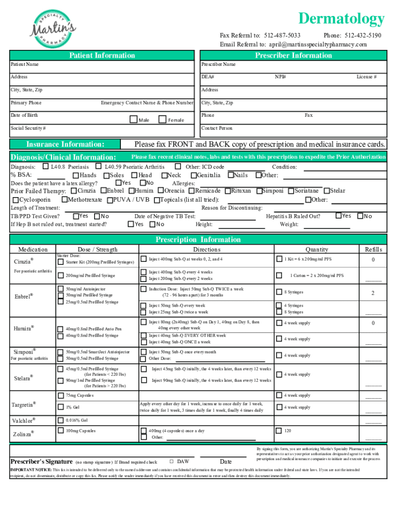 Dermatology Fax Referral to: 5124875033 Phone: 5124325190 Email Referral to: April martinsspecialtypharmacy. Compartment InformationPrescriber InformationPatient NamePrescriber NameAddressDEA#City,
