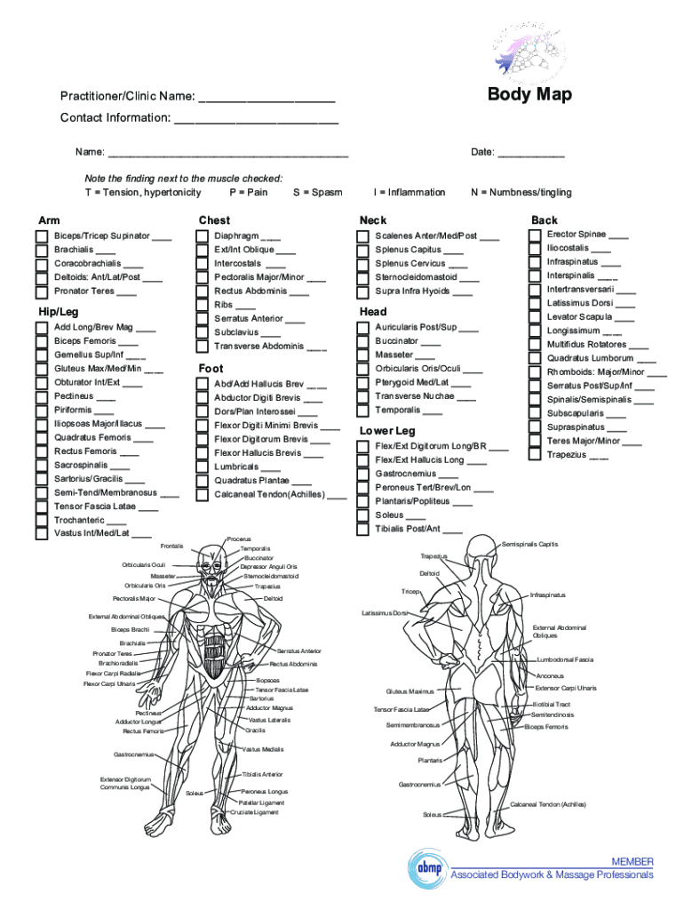 Body Practitioner/Clinic Name: Contact Information: Name: Note the finding next to the muscle checked: T Tension, hypertonicity P Primary Date: S SpasmChestI InflammationNeckBackScalenes After/Med/Post