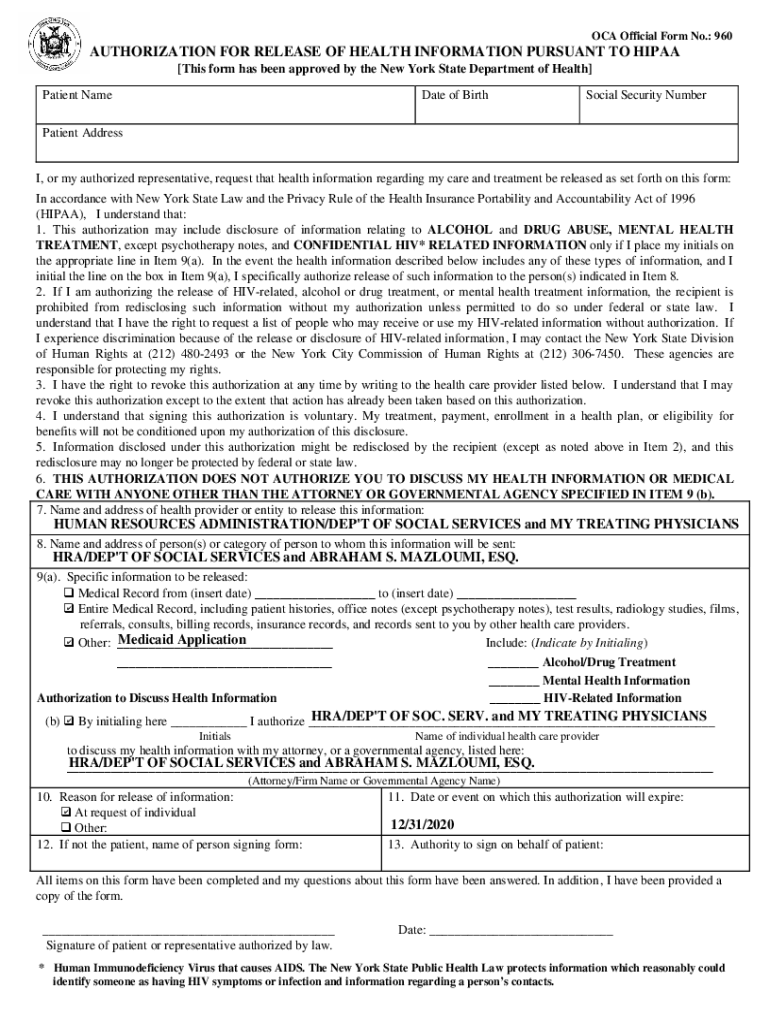 OCT Official Form No.: 960AUTHORIZATION FOR RELEASE OF HEALTH INFORMATION PURSUANT TO HIPAA This form has been approved by the New York State Department of Health Patient Name Date of Biosocial Security