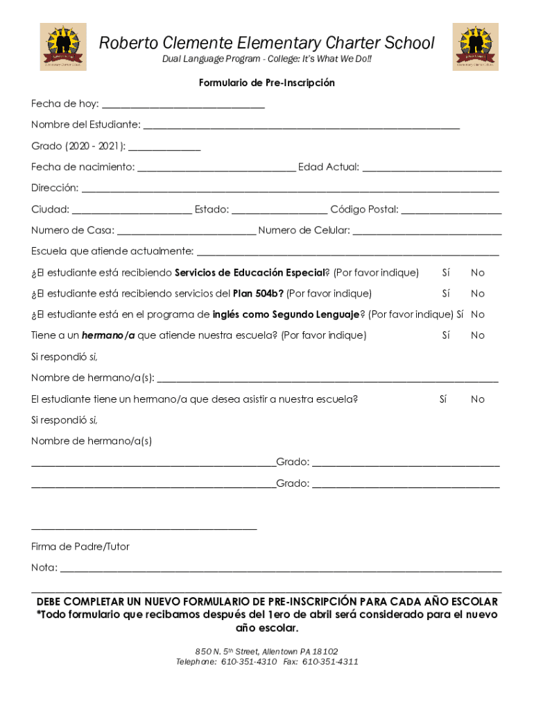 Roberto Clemente Elementary Charter School Dual Language Program College: Its What We Do!! Formulation de PreInscripcin Tech DE how: Hombre del Estudiante: Grade (2020 2021): Tech de Nascimento: Dad