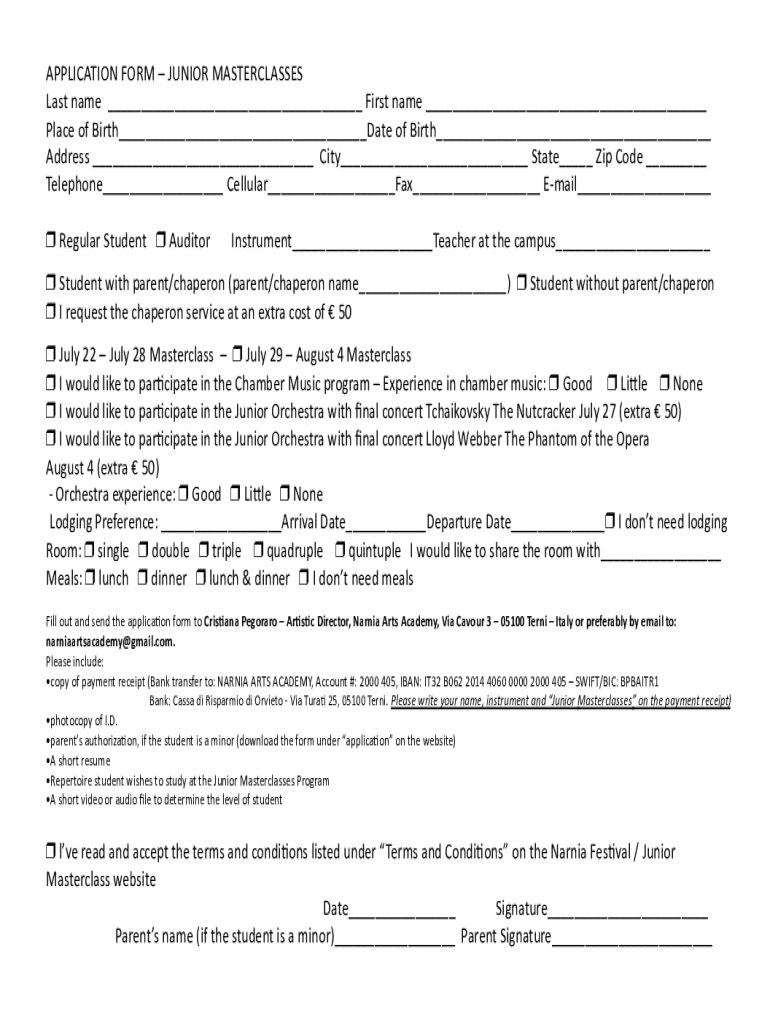 APPLICATION FORM JUNIOR MASTERCLASSESLast name First name Place of Birth Date of Birth Address City State Zip Code Telephone Cellular Fax Email ... Regular Student AuditorInstrument Teacher at the