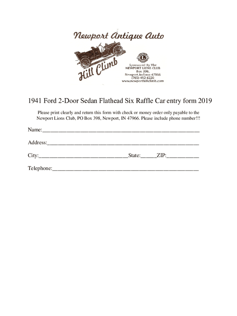 1941 Ford 2Door Sedan Flathead Six Raffle Car entry form 2019 Please print clearly and return this form with check or money order only payable to the Newport Lions Club, PO Box 398, Newport, IN 47966.