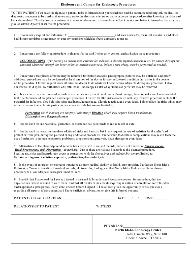 Anyone who is scheduled for or considering undergoing a colonoscopy procedure needs to fill out a colonoscopy consent form.