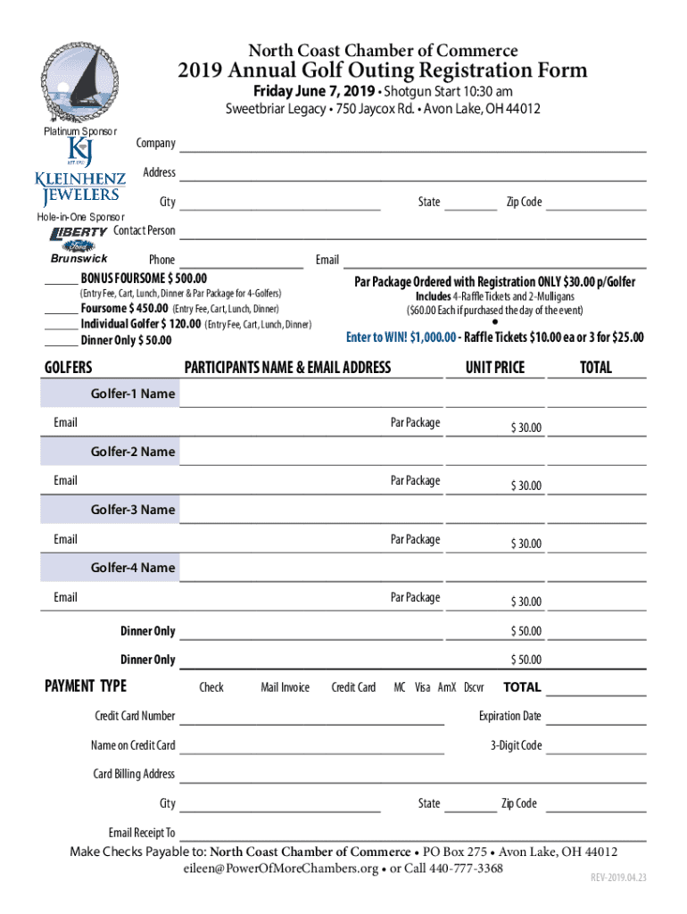 North Coast Chamber of Commerce2019 Annual Golf Outing Registration Form Friday, June 7, 2019, Shotgun Start 10:30 sweetbrier Legacy 750 Jay cox Rd. Avon Lake, OH 44012 Platinum SponsorCompany AddressHoleinOne