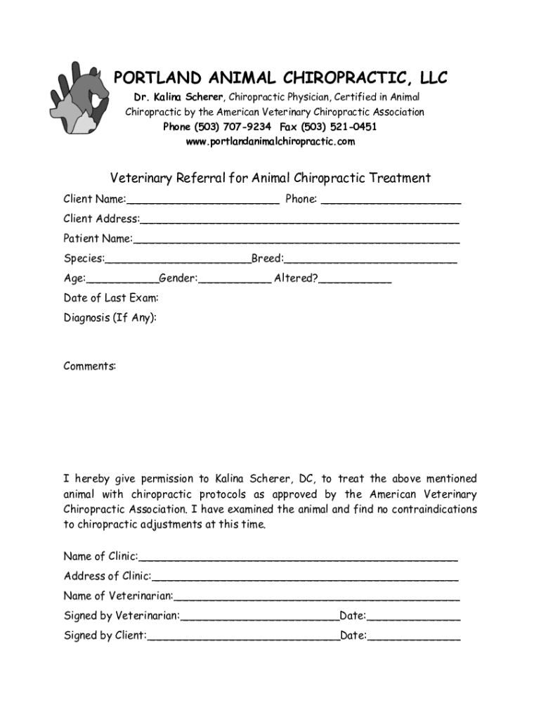 PORTLAND ANIMAL CHIROPRACTIC, LLC Dr. Karina Shear, Chiropractic Physician, Certified in Animal Chiropractic by the American Veterinary Chiropractic Association Phone (503) 7079234 Fax (503) 5210451
