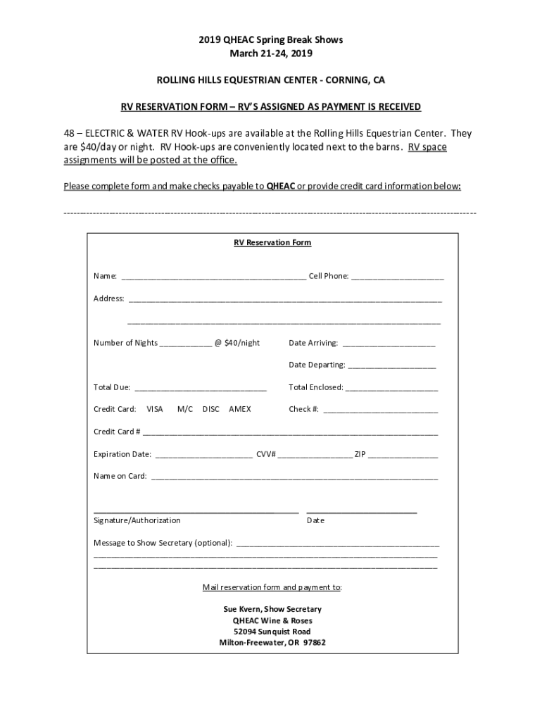 2019 HEAD Spring Break Shows March 2124, 2019 ROLLING HILLS EQUESTRIAN CENTER CORNING, CA RV RESERVATION FORM RVs ASSIGNED AS PAYMENT IS RECEIVED 48 ELECTRIC & WATER RV Hookups are available at the