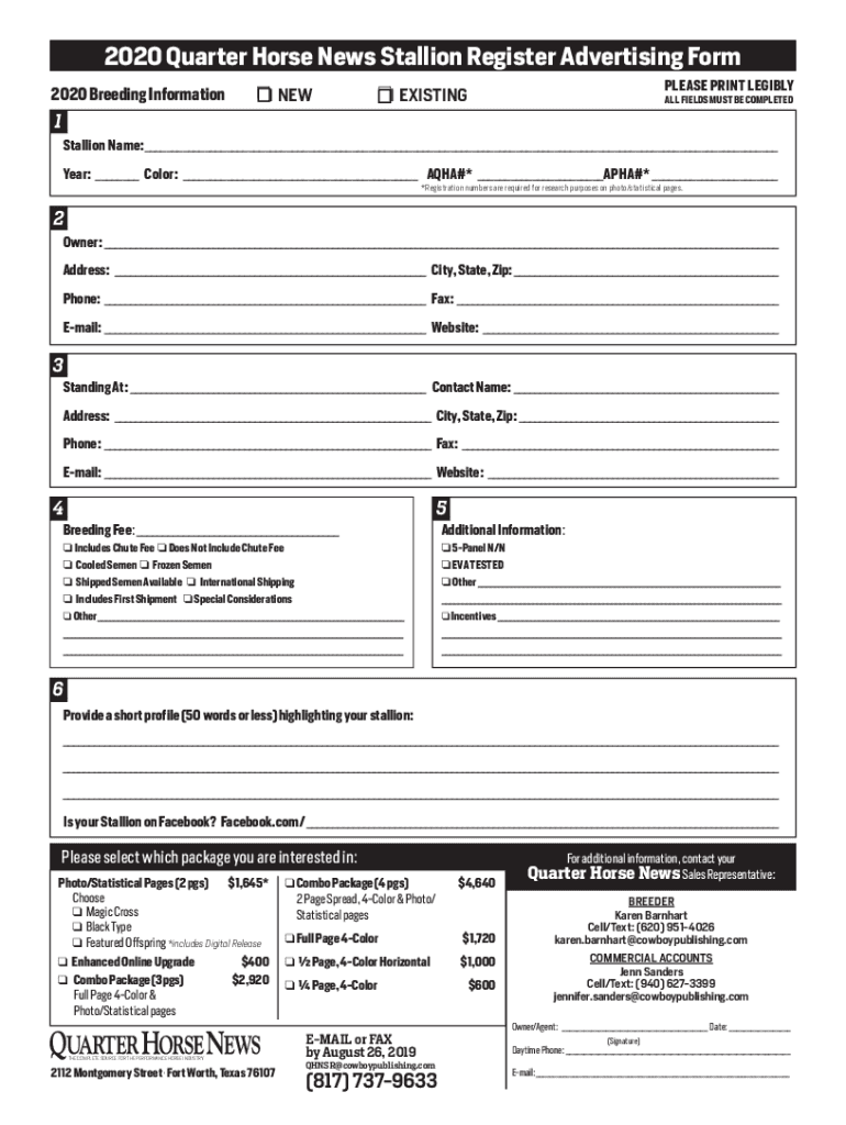 2020 Quarter Horse News Stallion Register Advertising Form 2020 Breeding Information RELEASE PRINT LEGIBLY EXISTING ALL FIELDS MUST BE COMPLETED1 Stallion Name: Year: Color: AQUA#* ALPHA#* *Registration