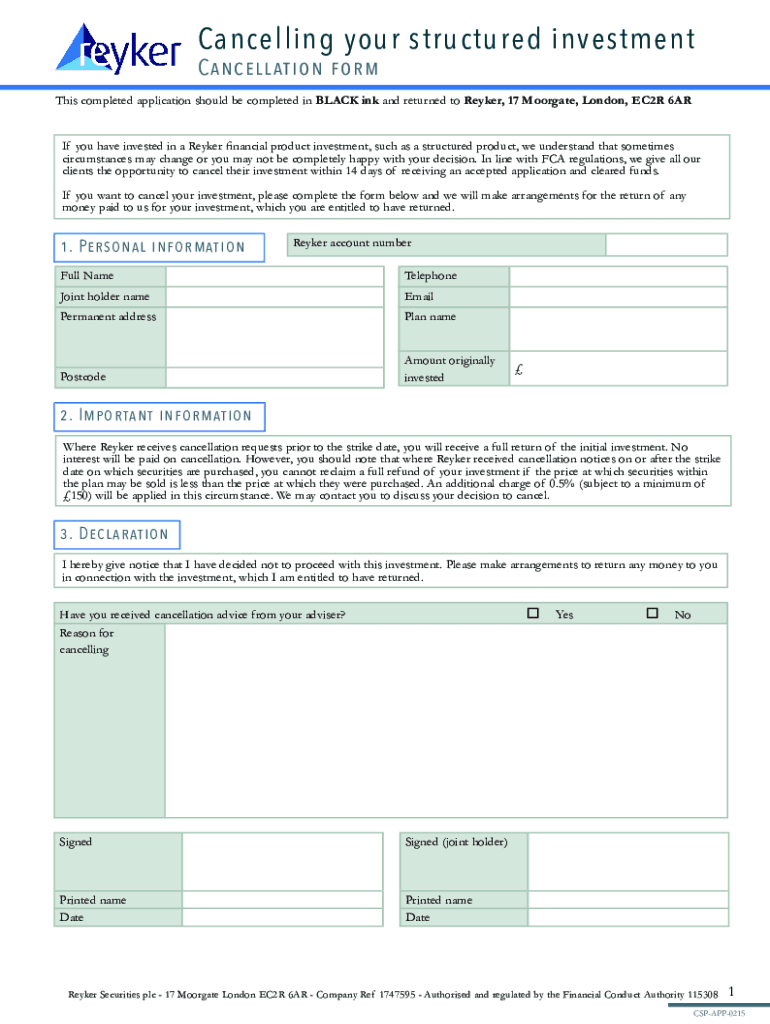 Cancelling your structured investmentCancellation forms completed application should be completed in BLACK ink and returned to Baker, 17 Moor gate, London, EC2R 6ARIf you have invested in a Baker