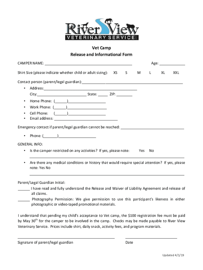 Vet Camp Release and Informational Form CAMPER NAME: Shirt Size (please indicate whether child or adult sizing):Stage: MLXLXXLContact person (parent/legal guardian): Address: City: State: ZIP: Home