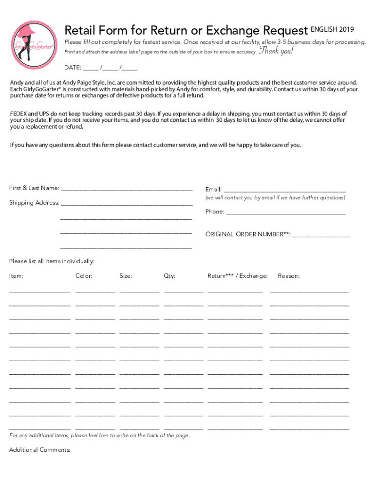 Retail Form for Return or Exchange Request ENGLISH 2019Please fill out completely for fastest service. Once received at our facility, allow 35 business days for processing. Print and attach the address